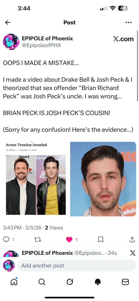 March 5, 2026 taraomunson Video: HOLLYWOOD DOESNT WANT US TO KNOW THAT JOSH PECK & Nickelodeon sex offender BRIAN PECK are related! https://www.tiktok.com/t/ZTh7TryQu/ Share this: Share on X (Opens in new window) X Share on Facebook (Opens in new window) Facebook Like Loading... Related